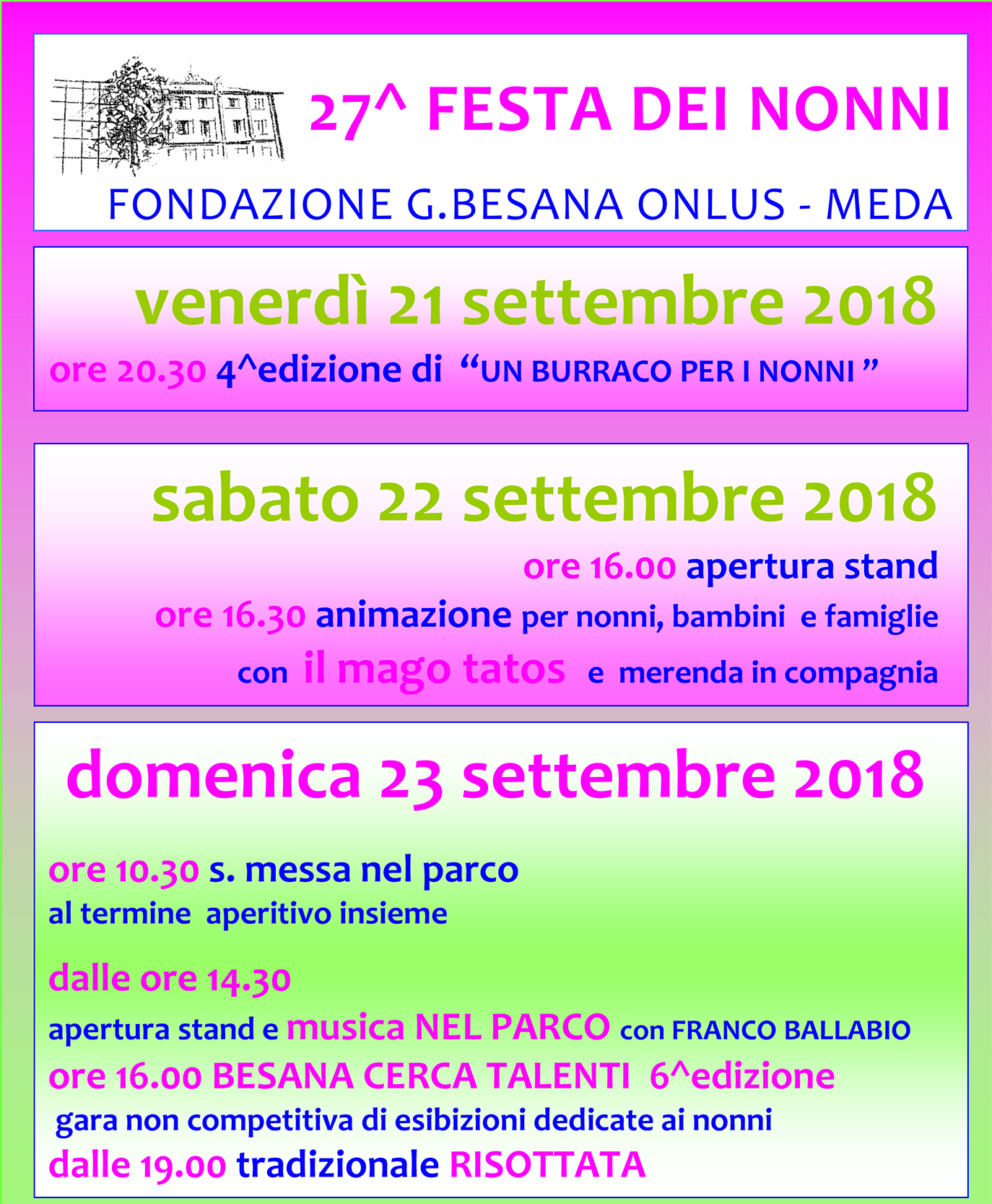 Domenica 23 Settembre 2018, il Gruppo Volontari Medesi invita a partecipare alla Festa dei nonni presso la RSA Fondazione Besana. Il gruppo sarà presente nelle vendite agli stand e alla distribuzione del risotto. Per informazioni contattare il numero 320.38.23.018 Anche quest'anno la festa viene proposta, a tutela degli Ospiti. Verrà celebrata una S. Messa al mattino, a seguire stands aperti (con torte, fiori e prosecco) ed dalle 19,00 tradizioinale risottata! Nel pomeriggio... Besana cerca talenti! gara non competitiva di esobizioni dedicate ai nonni